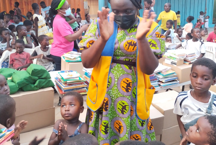 They express their joy by singing and dancing with the children.